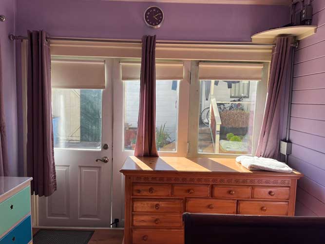 This cute studio room has its own entrance, on-site laundry, drawers and an armoire for your clothes, linens, plenty of heat, plenty of light, and high-speed internet. There is a small auxiliary kitchen with sink, microwave, and fridge right by the bedroom, and a larger kitchen and bath for this room across the patio, twenty feet away from the bedroom.
