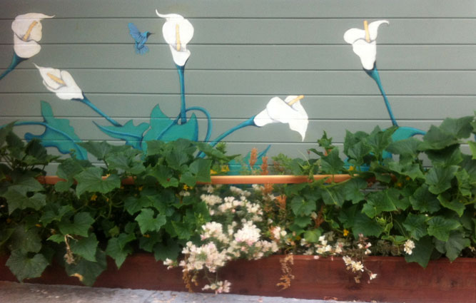 The flat has three bedrooms, a big, airy living room, nice kitchen, on-site laundry, drawers and closets for your clothes, linens, plenty of heat, plenty of light, and high-speed Internet. Each bedroom has something special: a private patio, private entrance, or an in-room plumbed vanity.